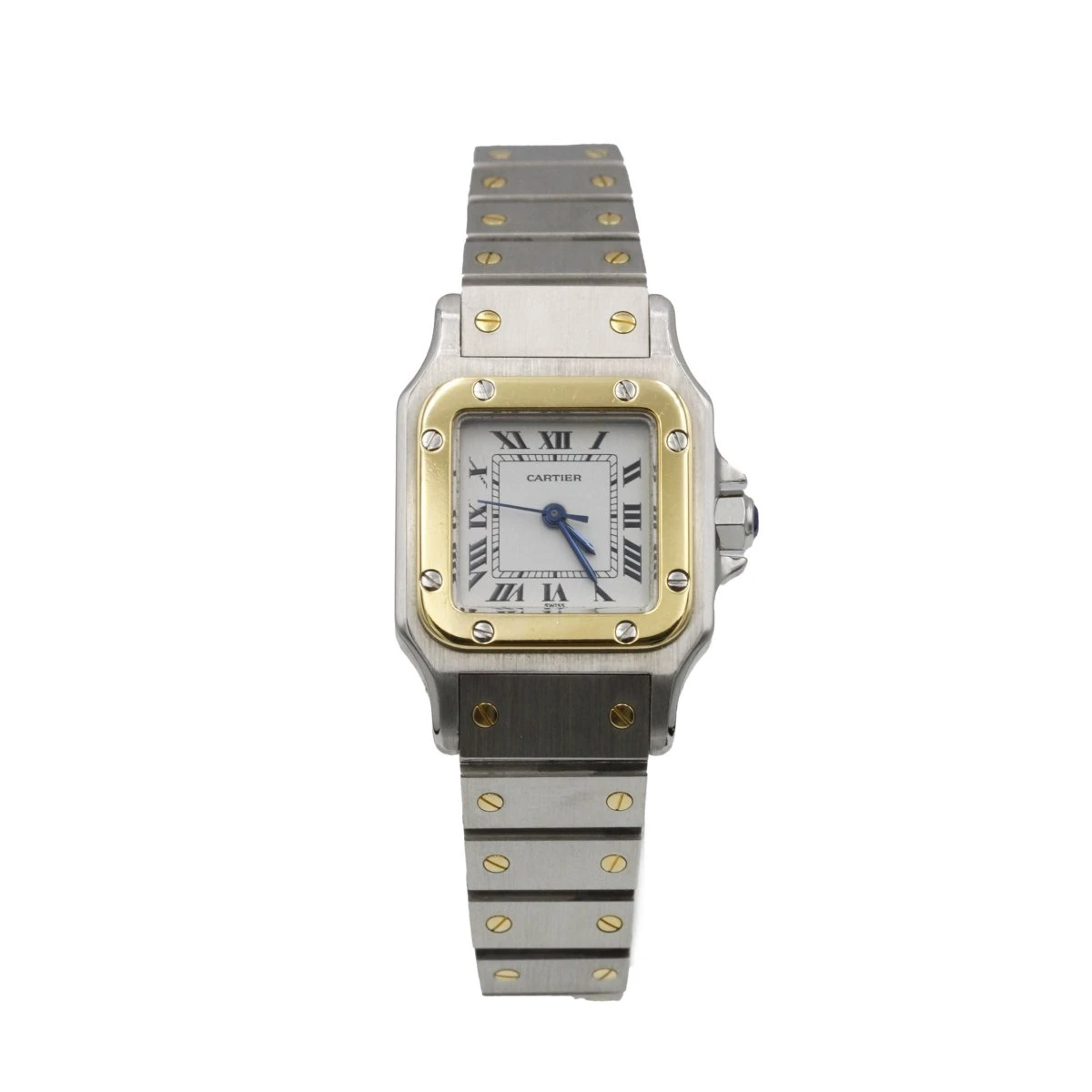 Montre « Santos » signée CARTIER, petit modèle, en or jaune et acier avec cadran blanc, avec chiffres romains, aiguilles glaives bleues, datant des années 80/90.