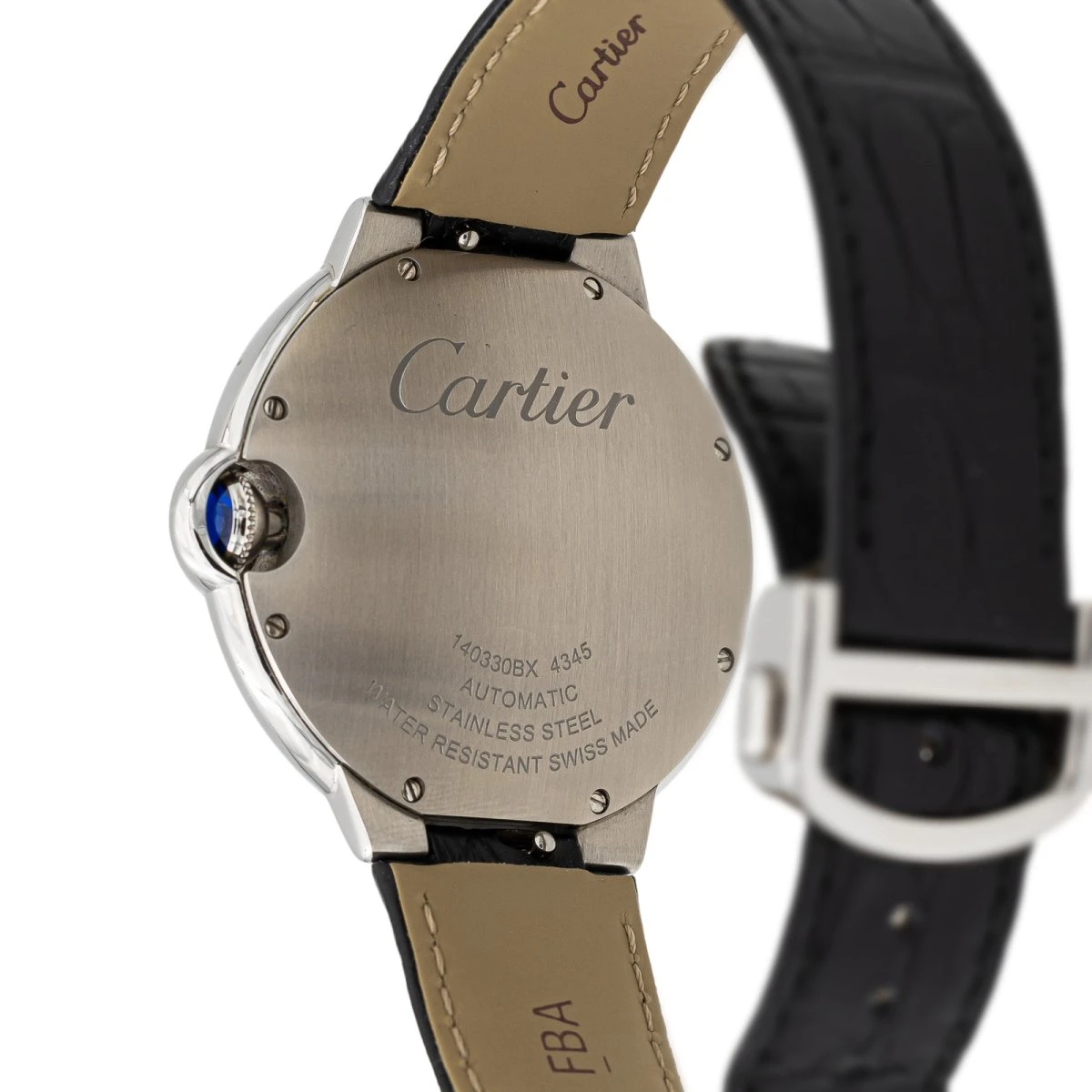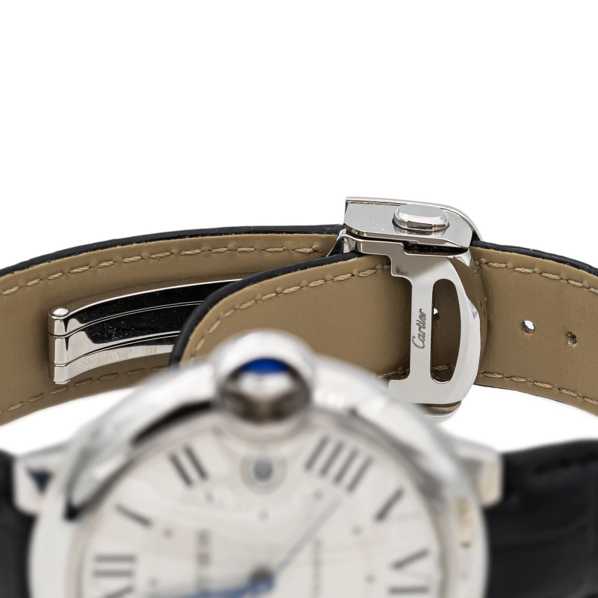 Montre Cartier modèle Ballon bleu acier. cadran argenté guilloché à chiffres romains. mouvement mécanique à remontage automatique. boîtier 40 mm. verre saphir. bracelet cuir d’aligator à boucle déployante interchangeable. Longueur 17 cm (ajustable) Largeur 1.6 cm. poids total 68.76 g. full set (écrin d’origine et garantie). année 2023. Excellent état
