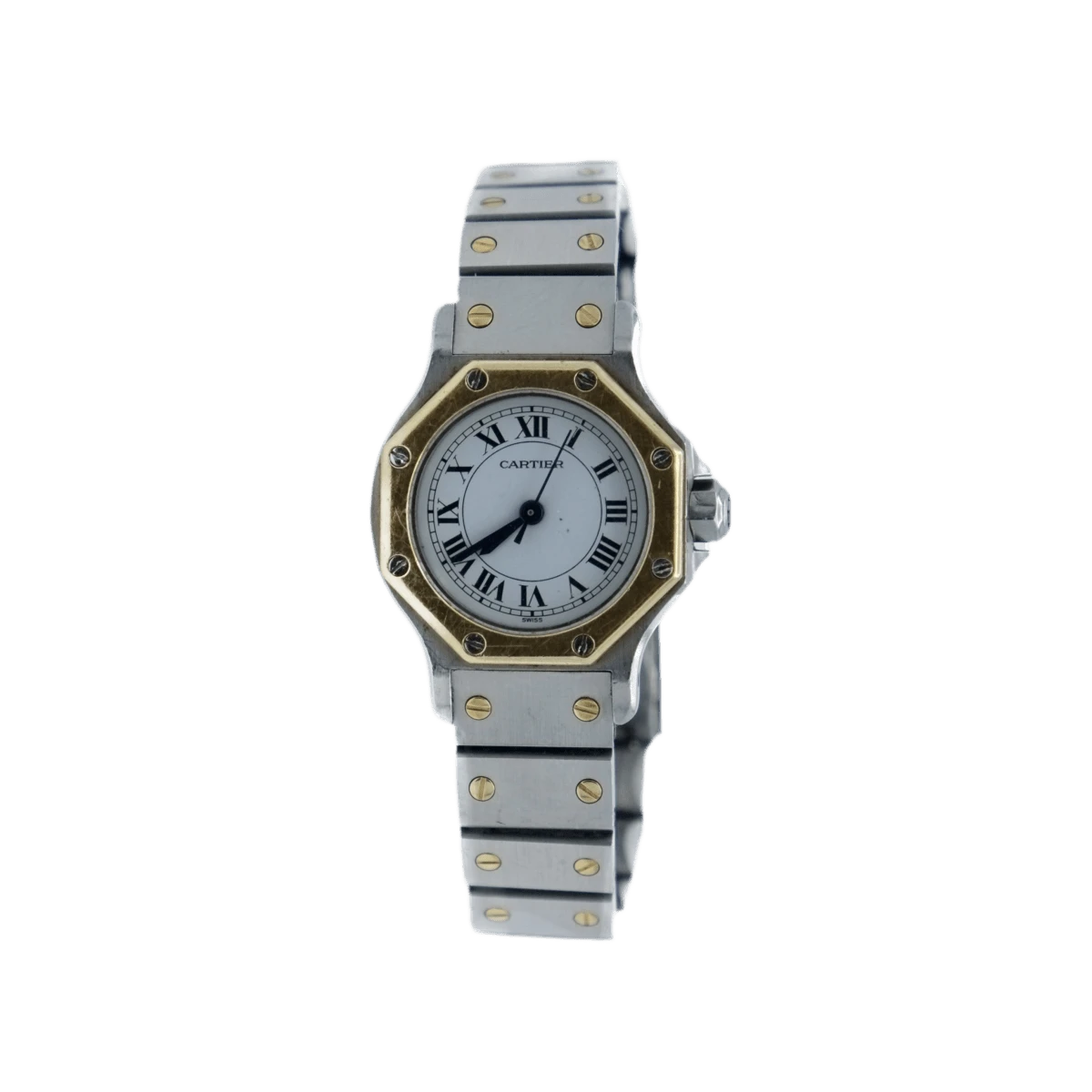 Montre CARTIER, modèle « Santos » en or jaune 18 carats et acier, mouvement automatique, cadran blanc à chiffres romain avec des aiguilles glaive en acier