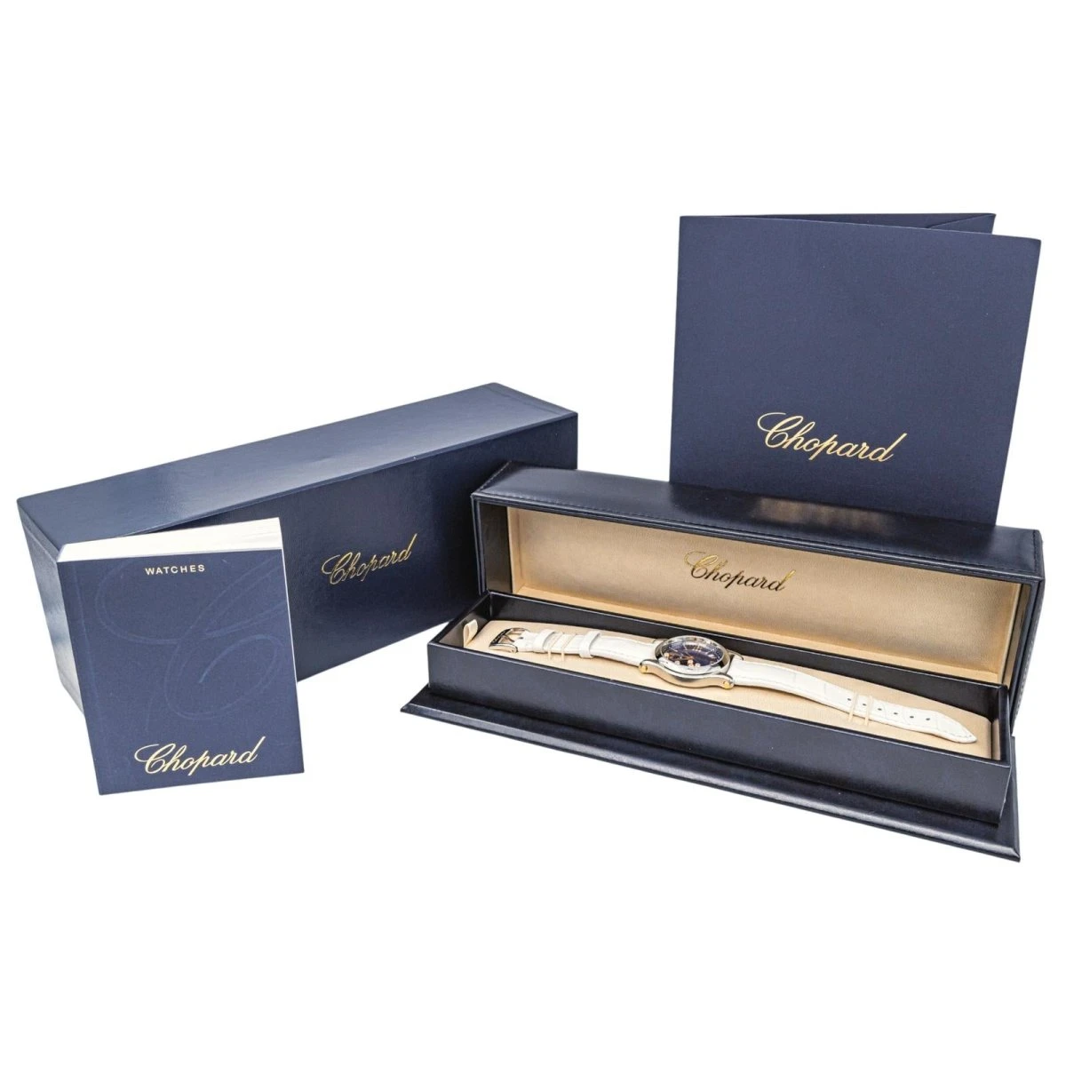 Montre Chopard modèle Happy Sport acier & or rose « 750 millièmes (18 carats) ». cadran bleu à chiffres romains. sertie de 5 diamants mobiles. d’un poids total d’environ 0.24ct (chaque diamant d’un poids d’environ 0.05ct). mouvement à quartz. boîtier 36 mm. verre saphir. bracelet cuir à boucle ardillon (taille poignet 18 cm ajustable. largeur bracelet 1.74 cm). poids total : 53.72 g. full set (boite et papier d’origine). année 2025. garantie. excellent état jamais portée.