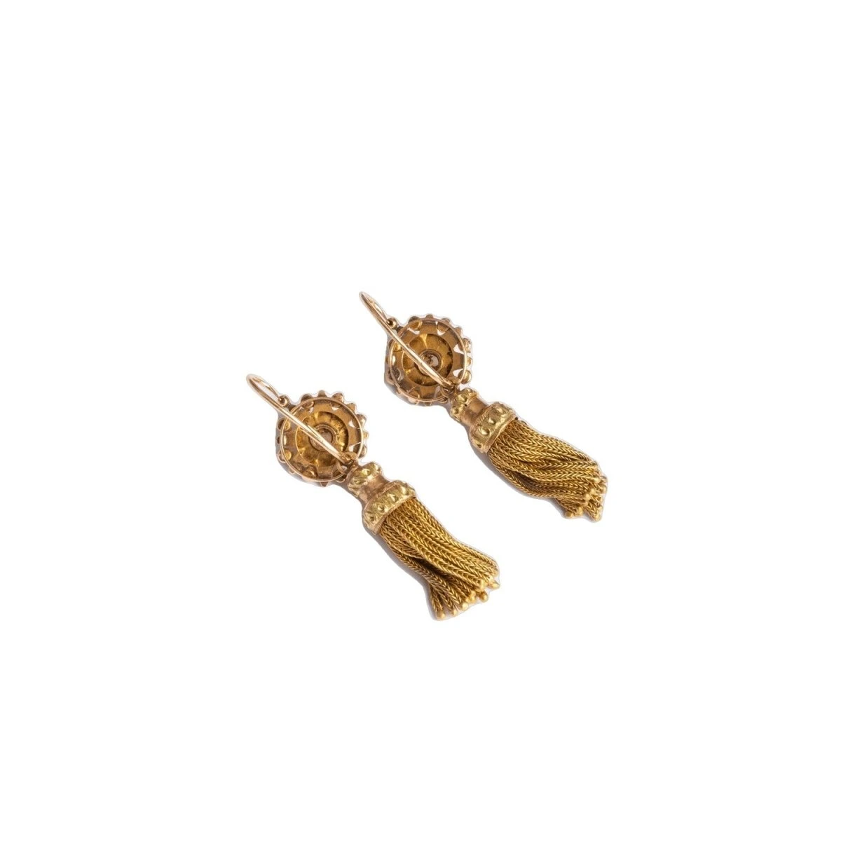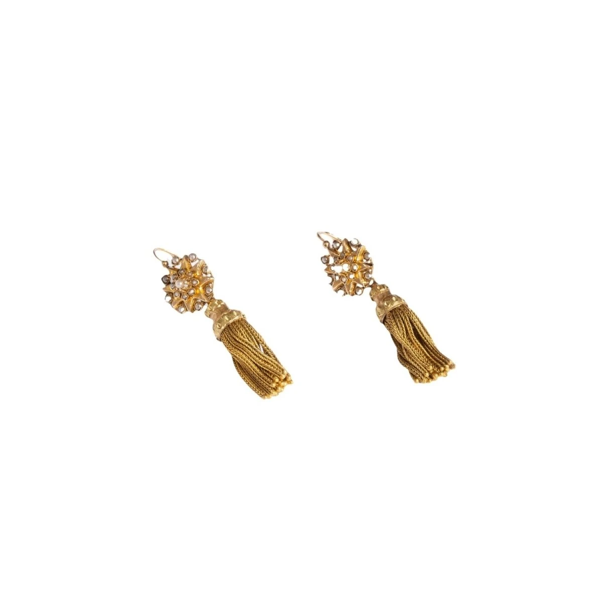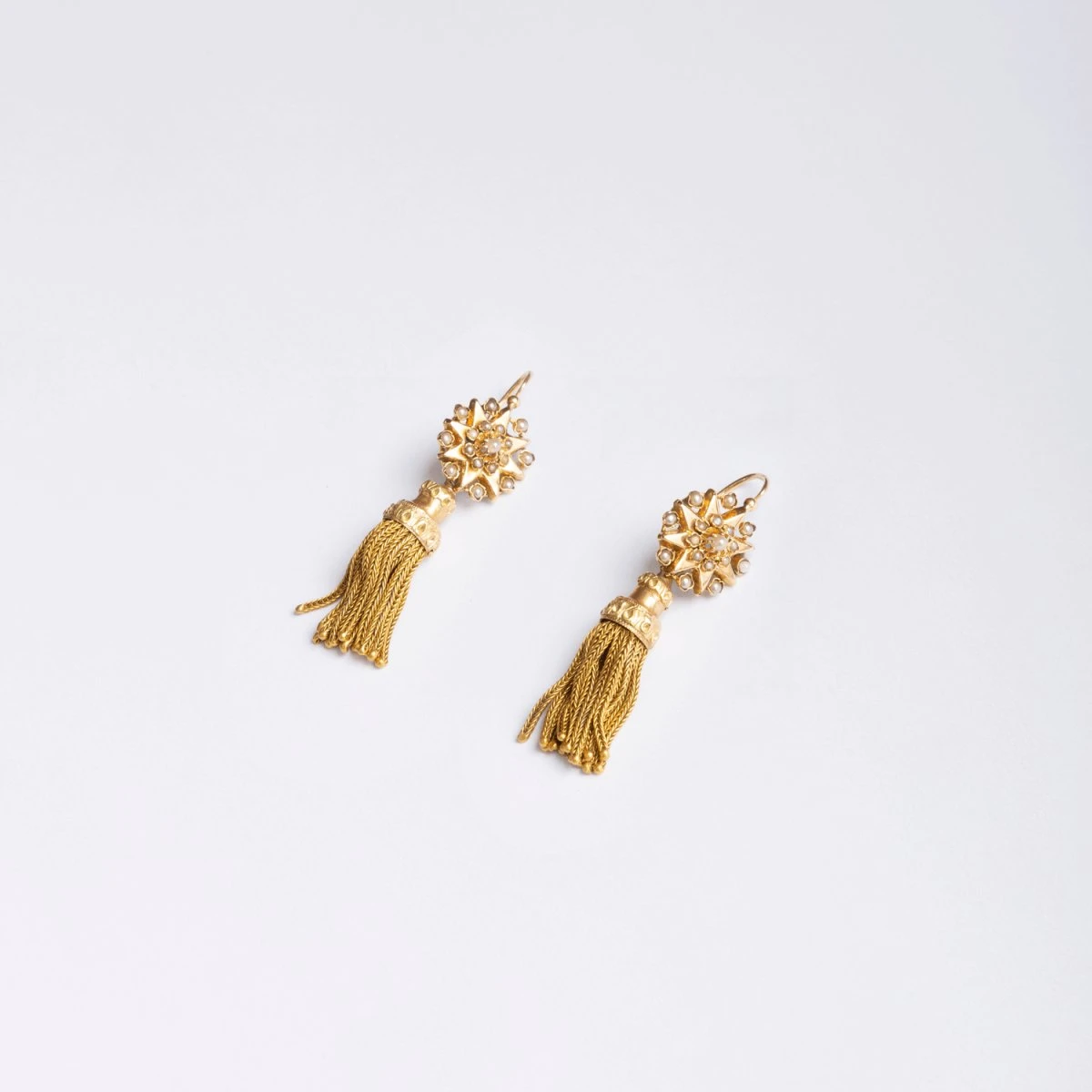 Paire de boucles d’oreilles Dormeuses en or jaune 18 carats, composée de deux éléments à motifs étoilés ornés de perles, retenant des pompons.