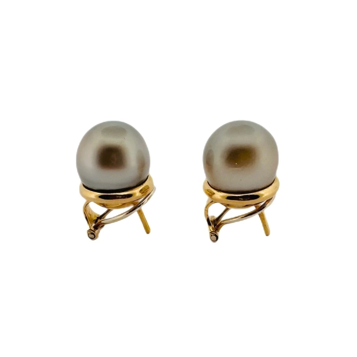Boucles d’oreilles or jaune 18 carats et perles de Tahiti, attribuées à BULGARI. Système pour oreilles percées.