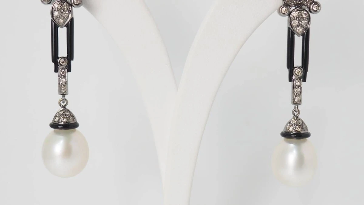 Paire De Pendants D’oreilles En Or Blanc Diamants Cognacs Et Perles