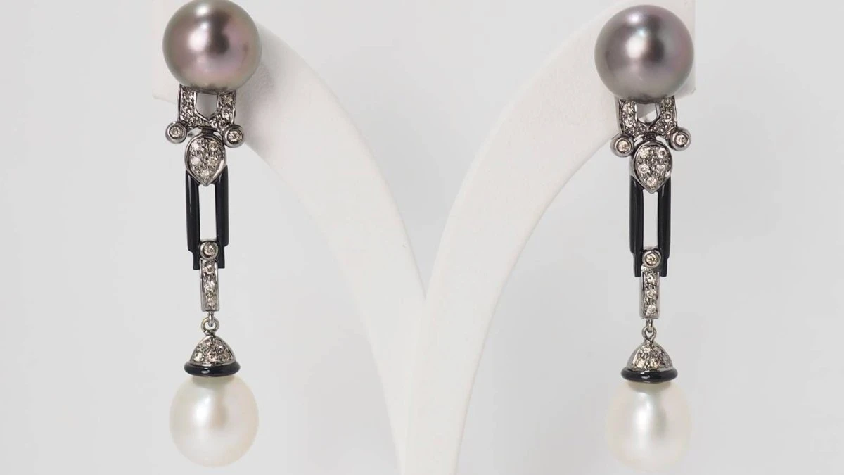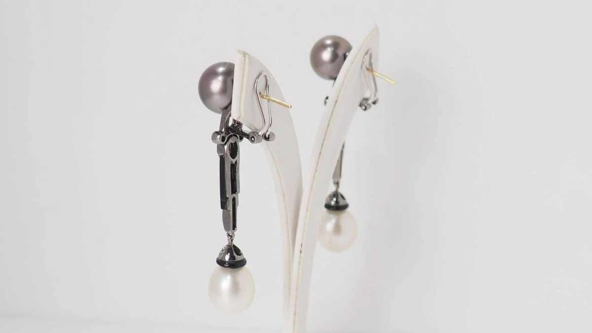 - Perle de Tahiti (⌀ 12 mm) de couleur grise aubergine et perle d’Akoya blanches (ø11,5 mm) ;