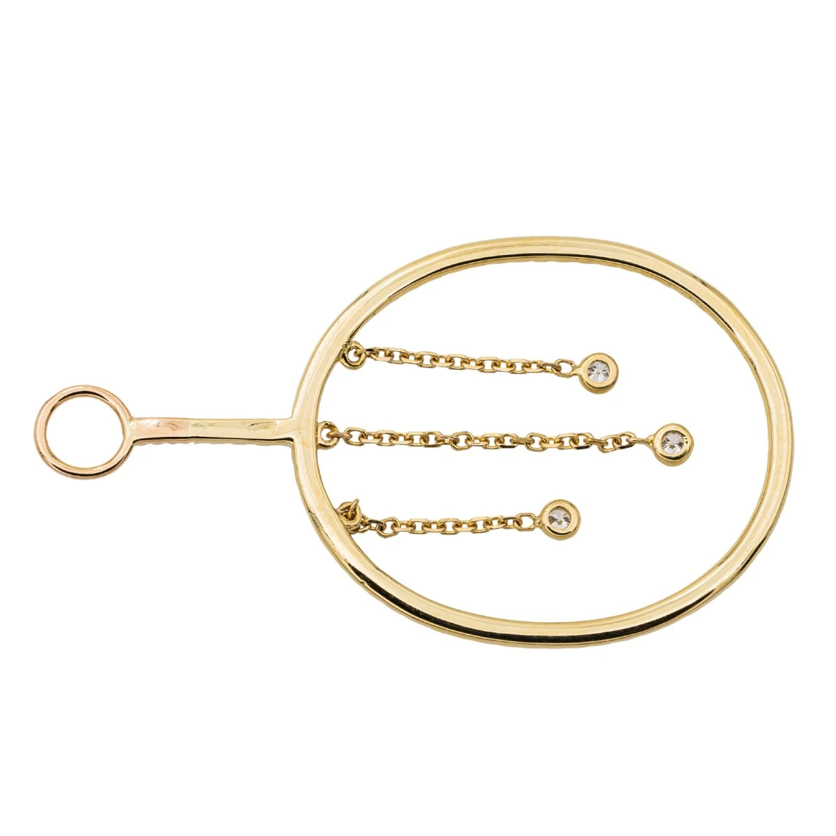 Pendentif en or jaune 750 millièmes (18 carats) testé. orné de 3 pampilles mobiles. serti de 70 diamants taille brillant. pour un poids total d’environ 0.45 ct (3 diamants pesant environ 0.015 ct chacun et 67 diamants pesant environ 0.006 ct chacun). dimensions avec bélière : 4.17 cm x 2.32 cm. poids total : 1.56 g. en excellent état.